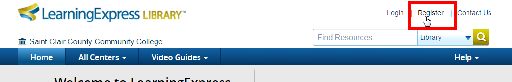 - In Learning Express Library, go to "Sign in/Register" as shown below.